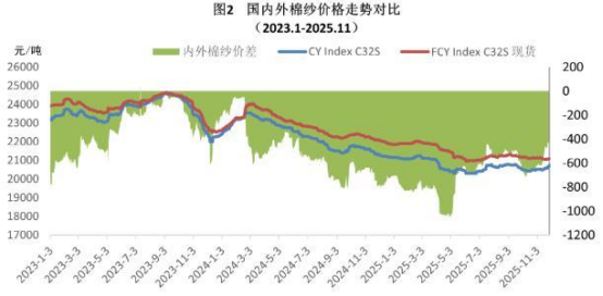 本月棉花市場(chǎng)反彈帶動(dòng)國(guó)內(nèi)棉紗價(jià)格暫時(shí)企穩(wěn),但整體市場(chǎng)未有顯著改善,終端需求偏弱與庫(kù)存壓力對(duì)漲幅造成壓制,短期市場(chǎng)仍將維持震蕩偏穩(wěn)運(yùn)行。進(jìn)口棉紗價(jià)格維持跌勢(shì),雖然有溯源訂單支撐,但下游接受度不高,實(shí)際成交優(yōu)惠力度較大。國(guó)產(chǎn)32支純棉紗11月均價(jià)為20564元/噸,環(huán)比上漲94元/噸,增幅0.5%,同比下跌931元/噸,跌幅4.3%;進(jìn)口32支純棉紗月均價(jià)為21097元/噸,環(huán)比下跌33元/噸,跌幅0.2%,同比下跌1090元/噸,跌幅4.9%。