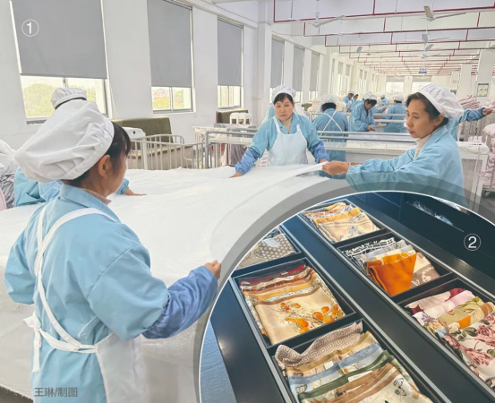 在中游,原料穩(wěn)定保障智能制造。在生產車間,太湖雪探索出了“現(xiàn)代技術+傳統(tǒng)工藝”的融合模式。智能剪裁設備按設計圖紙精準裁切蠶絲棉片,保障了批量生產的尺寸一致性;而手工拉絲這一核心非遺工藝被完整保留,工人們身著統(tǒng)一的藍色工裝,按標準將棉片層層拉伸梳理,鋪展成均勻蓬松的被芯。這種人機協(xié)作的方式,既保證了蠶絲被的天然蓬松度,又解決了規(guī)?;a的效率與標準化難題。