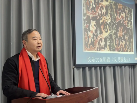 四川省絲綢科學研究院黨委書記、董事長程明在致辭中指出,這件國寶不僅是漢代絲綢技藝的巔峰之作,更是中華文明多元一體、東西交流的生動見證。它的出土為研究古代絲綢技術、紋樣藝術、歷史文化乃至天文觀念打開了珍貴窗口,也時刻提醒當代絲綢人肩負的歷史責任。他介紹,四川省絲綢科學研究院長期致力于絲綢科技與文化遺產保護,近年來在蜀錦蜀繡非遺數(shù)字化保護、紋樣數(shù)據(jù)庫建設、以及蜀錦與香云紗雙非遺融合產品創(chuàng)新等方面取得了系列成果。程明表示,紀念“五星出東方”出土三十周年,不僅是一次文化致敬,更是面向未來的再出發(fā),期待凝聚各界力量,構建協(xié)同機制,讓中華絲綢文明持續(xù)綻放光彩。