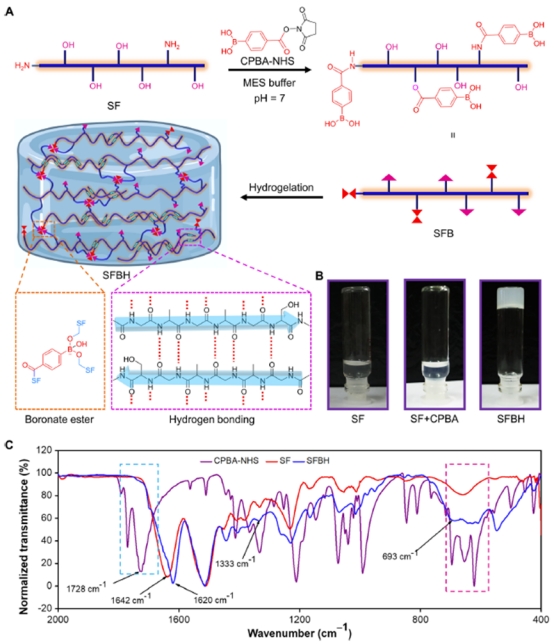圖1.苯硼酸修飾絲素蛋白自組裝成膠過程與紅外光譜分析圖