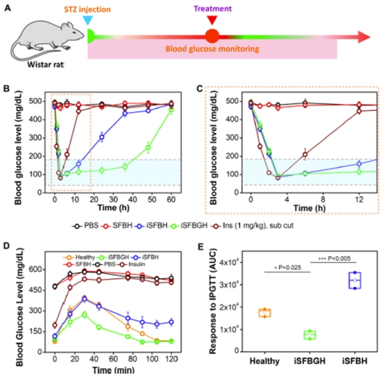 本研究成功開發(fā)了一種葡萄糖響應(yīng)性絲素蛋白水凝膠(SFBGH),該水凝膠具有多孔形態(tài)和高度交聯(lián)的絲素蛋白組裝結(jié)構(gòu),能夠調(diào)節(jié)包裹GOx的功能活性,并實現(xiàn)葡萄糖響應(yīng)性基質(zhì)降解。在高血糖條件下,水凝膠可通過結(jié)構(gòu)重排,實現(xiàn)胰島素的高效包埋與釋放。在糖尿病Wistar大鼠皮下注射該水凝膠,可實現(xiàn)胰島素的可控遞送并能長期維持正常血糖水平。本研究開發(fā)的SFBGH可作為閉環(huán)人工胰腺用于胰島素可控遞送,為糖尿病精準(zhǔn)治療提供新方案,且絲素蛋白原料易獲取、易加工,具良好的應(yīng)用前景。