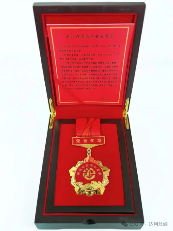 浙江省優(yōu)秀企業(yè)家評選旨在表彰 “創(chuàng)新驅(qū)動,突破瓶頸,打造浙江發(fā)展新引擎” 的企業(yè)帶頭人,張金珍在數(shù)十年的從業(yè)生涯中,身體力行,始終以實(shí)際行動一步一個(gè)腳印踐行著這些標(biāo)準(zhǔn) 。為新時(shí)代絲綢行業(yè)高質(zhì)量發(fā)展提供了新的發(fā)展模式和樣板。這次張總被評為第二十四屆浙江省優(yōu)秀企業(yè)家光榮稱號,既是對張總個(gè)人成績的肯定更是達(dá)利絲綢全體員工的光榮。