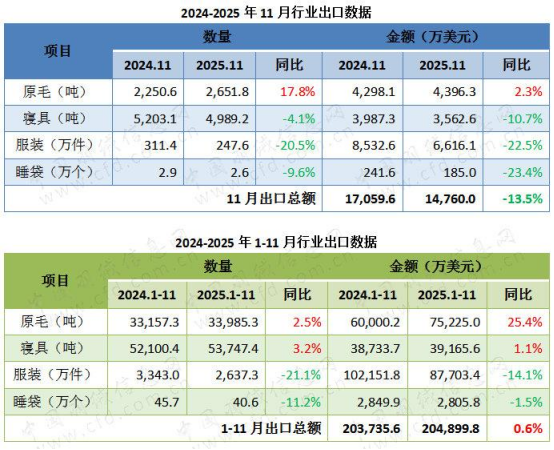 2025年11月,行業(yè)出口總額為1.5億美元,同比下降13.5%,環(huán)比上月下降8.5%。其中原毛出口量同比增長(zhǎng)17.8%,但出口額僅微增2.3%,平均單價(jià)下跌13.2%。寢具與服裝均呈現(xiàn)“量?jī)r(jià)齊跌”特征,出口量分別下降4.1%和20.5%,出口額降幅10.7%和22.5%,均大于數(shù)量降幅,表明平均單價(jià)下滑。