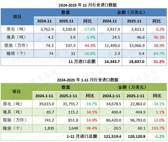 綜合1-11月,行業(yè)進(jìn)口總額約12.0億美元,同比下降1.2%。其中,原毛進(jìn)口量值齊跌,服裝進(jìn)口量值均有所上漲。