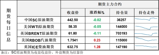 【1】WTI主力原油期貨收跌每桶58.35美元,相比前一交易日下跌3美分,跌幅0.05%。布倫特原油期貨結算價為每桶62.24美元較之前下跌14美分,跌幅0.22%。;INE原油期貨收跌0.02%,報442.5元。