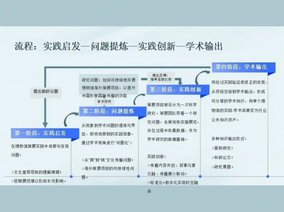 報(bào)告研究當(dāng)今博物館從業(yè)者都面臨有限的資源(預(yù)算、人力、時(shí)間等)與現(xiàn)代博物館的多樣化責(zé)任(保存、研究、教育、國(guó)際傳播等)之間的矛盾,認(rèn)為解決該矛盾的模式是將實(shí)踐與學(xué)術(shù)進(jìn)行深度融合,即將“行動(dòng)中的認(rèn)識(shí)”轉(zhuǎn)化為可供系統(tǒng)探究的學(xué)術(shù)問(wèn)題,學(xué)術(shù)研究又賦予策展實(shí)踐以深刻的洞察力和創(chuàng)新方向的雙向賦能機(jī)制。以“國(guó)絲環(huán)球展柜”為例,通過(guò)踐行“實(shí)踐與學(xué)術(shù)深度融合”,實(shí)現(xiàn)海外策展項(xiàng)目的可持續(xù)發(fā)展,其核心是將展覽視為“學(xué)術(shù)田野”,每一次策展都視為一次“實(shí)踐研究”;流程是“實(shí)踐啟發(fā)——問(wèn)題提煉——實(shí)踐創(chuàng)新——學(xué)術(shù)輸出”。