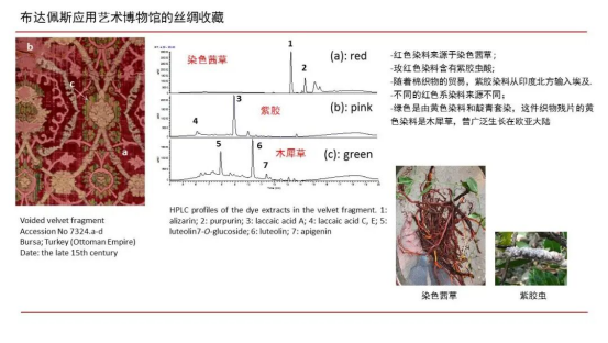 本研究使用高效液相色譜-離子阱質(zhì)譜(HPLC-IT-MS)對(duì)中國(guó)絲綢博物館、北京藝術(shù)博物館和布達(dá)佩斯應(yīng)用藝術(shù)博物館獲得的歷史紡織品進(jìn)行了染料分析。檢測(cè)結(jié)果揭示了15至19世紀(jì)東西方使用的天然染料。在中國(guó)和歐洲的紡織品中,蘇木和靛青被用來(lái)染紅色和藍(lán)色。然而,染色茜草和木犀草僅用于歐洲紡織品,而紅花和槐米則常用于中國(guó)紡織品著色。有趣的是,自16世紀(jì)初以來(lái)從墨西哥進(jìn)口到西班牙的美洲胭脂蟲(chóng)也在中國(guó)的龍袍和馬鞍中被發(fā)現(xiàn),這條線(xiàn)索為17世紀(jì)的全球貿(mào)易提供了間接證據(jù)。