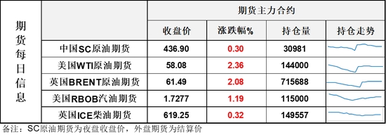 【1】WTI主力原油期貨收漲1.34美元,漲幅2.36%,報(bào)58.08美元/桶;布倫特主力原油期貨收漲1.25美元,漲幅2.08%,報(bào)61.49美元/桶;INE原油期貨收漲0.3%,報(bào)436.9元。
