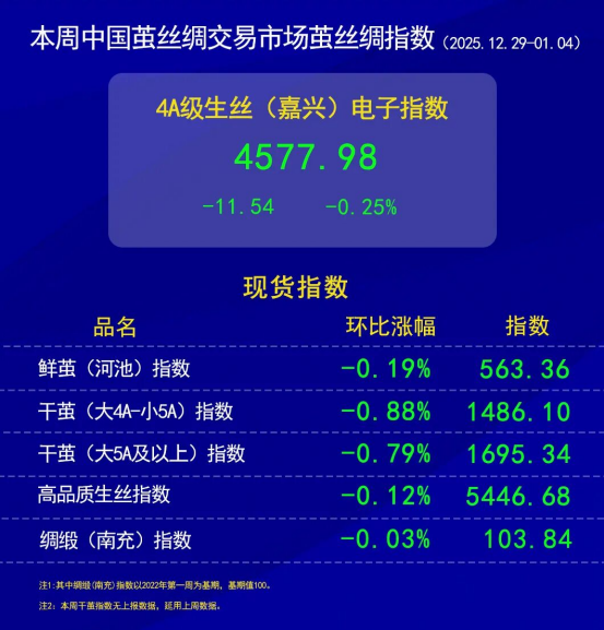 今日(2026年1月4日,周日)中國繭絲綢交易市場生絲電子指數(shù)微跌0.05%報(bào)收于4577.98點(diǎn),本周生絲指數(shù)累計(jì)下跌0.25%。B絲2022D(商檢4A級(jí)生絲):260125合約報(bào)平,收于45.78萬元;260325下跌0.06萬元報(bào)收45.90萬元;260925合約下跌0.03萬元報(bào)收45.75萬元。