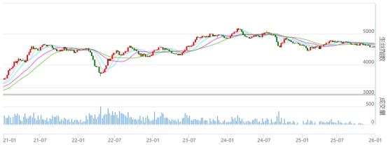 今日(周日)仍處于交易時(shí)段,生絲電子盤面各遠(yuǎn)近月合約價(jià)格延續(xù)小幅下調(diào)態(tài)勢。剔除元旦三日假期影響,本周生絲電子指數(shù)歷經(jīng)四個(gè)交易日震蕩調(diào)整,累計(jì)下跌0.25%,最終報(bào)收于4577.98點(diǎn)。