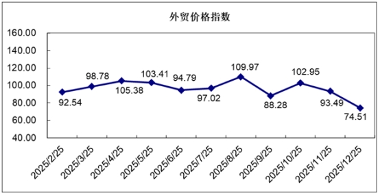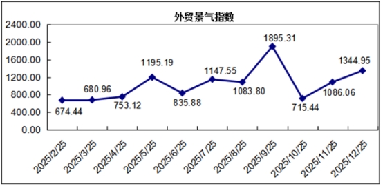 如圖1、圖2所示,2025年12月份外貿(mào)景氣指數(shù)收于1344.95點(diǎn),環(huán)比上漲23.84%,較年初比上漲97.33%,去年同比上漲89.01%;外貿(mào)價(jià)格指數(shù)收于74.51點(diǎn),環(huán)比下跌20.31%,較年初比下跌31.22%,去年同比下跌37.97%;外貿(mào)信心指數(shù)收于1013.28點(diǎn),環(huán)比上漲0.20%。