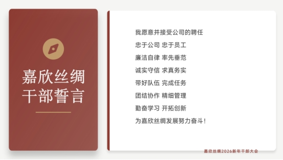 1月5日下午,嘉欣絲綢2026新年干部大會在嘉欣絲綢廣場會議中心隆重召開。會議明確新一年發(fā)展路徑,部署重點任務(wù),為集團(tuán)第十輪發(fā)展吹響奮進(jìn)號角。