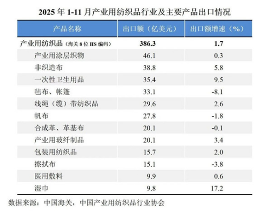 國際貿(mào)易方面,根據(jù)中國海關數(shù)據(jù)(海關8位HS編碼統(tǒng)計數(shù)據(jù)),2025年1-11月我國產(chǎn)業(yè)用紡織品行業(yè)的出口額為386.3億美元,同比增長1.7%;行業(yè)進口額為49.9億美元,同比增長3.8%。