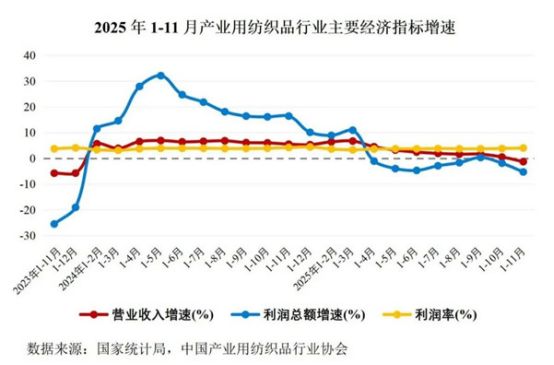2025年1-11月,全球經(jīng)濟在關稅政策演變、地緣沖突擾動、有效需求不足等多重風險積聚下仍面臨較大下行壓力;國內(nèi)經(jīng)濟運行延續(xù)總體平穩(wěn)、穩(wěn)中有進發(fā)展態(tài)勢,消費潛力持續(xù)釋放,外貿(mào)進出口穩(wěn)中有升。我國產(chǎn)業(yè)用紡織品行業(yè)經(jīng)濟運行穩(wěn)中趨緩,行業(yè)生產(chǎn)和出口保持穩(wěn)定,盈利能力依然承壓。