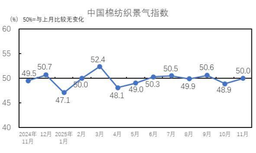 2025年11月,生產(chǎn)指數(shù)為50.9%,高于臨界點(diǎn),較10月上升2.5個(gè)百分點(diǎn),紡織企業(yè)生產(chǎn)情況較10月上升。從分項(xiàng)指數(shù)看,棉紡織企業(yè)設(shè)備開臺(tái)率指數(shù)為50.1%,高于臨界點(diǎn),較10月上升0.8個(gè)百分點(diǎn)。紗產(chǎn)量指數(shù)為50.3%,較10月上升1.9個(gè)百分點(diǎn);布產(chǎn)量指數(shù)為53.8%,較10月上升7.5個(gè)百分點(diǎn);紗產(chǎn)量指數(shù)和布產(chǎn)量指數(shù)均高于臨界點(diǎn)。