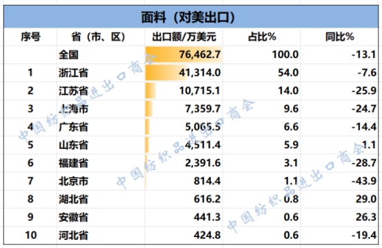2025年1-11月,我國(guó)紡織服裝累計(jì)對(duì)美出口411.43億美元,同比下降11.3%。浙江省、江蘇省、廣東省、山東省、上海分別列全國(guó)紡織服裝對(duì)美出口省市前五位,合計(jì)比重超八成。