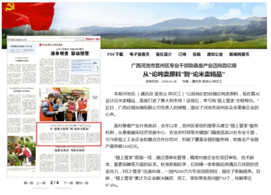 1月8日出版的《中國組織人事報(bào)》刊發(fā):《廣西河池市宜州區(qū)專業(yè)干部助桑蠶產(chǎn)業(yè)邁向百億級(jí) 從“論噸賣原料”到“論米賣精品”》。全文如下。