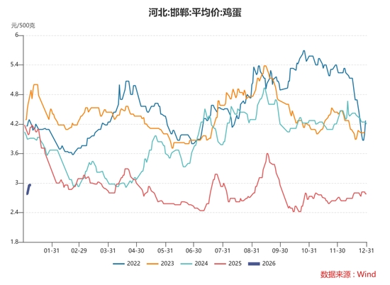 2025年四季度,雞蛋(3976, -26.00, -0.65%)現(xiàn)貨價格持續(xù)低位震蕩。不過自元旦開始,雞蛋現(xiàn)貨價格出現(xiàn)小幅走強(qiáng)跡象。以河北敦樸貿(mào)易為例,45斤雞蛋報價從1月1日的121元上漲至1月8日131元。我們分析認(rèn)為,1月份開始雞蛋現(xiàn)貨價格將逐步具備走強(qiáng)動能。
