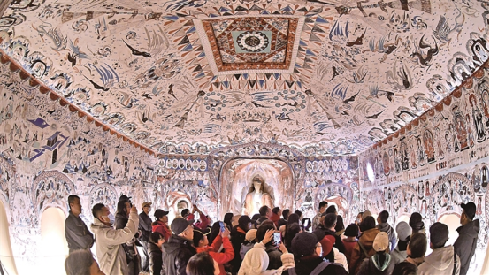 北京,觀眾在參觀“如是莫高”敦煌藝術(shù)大展中展出的莫高窟第285窟的復(fù)刻版本