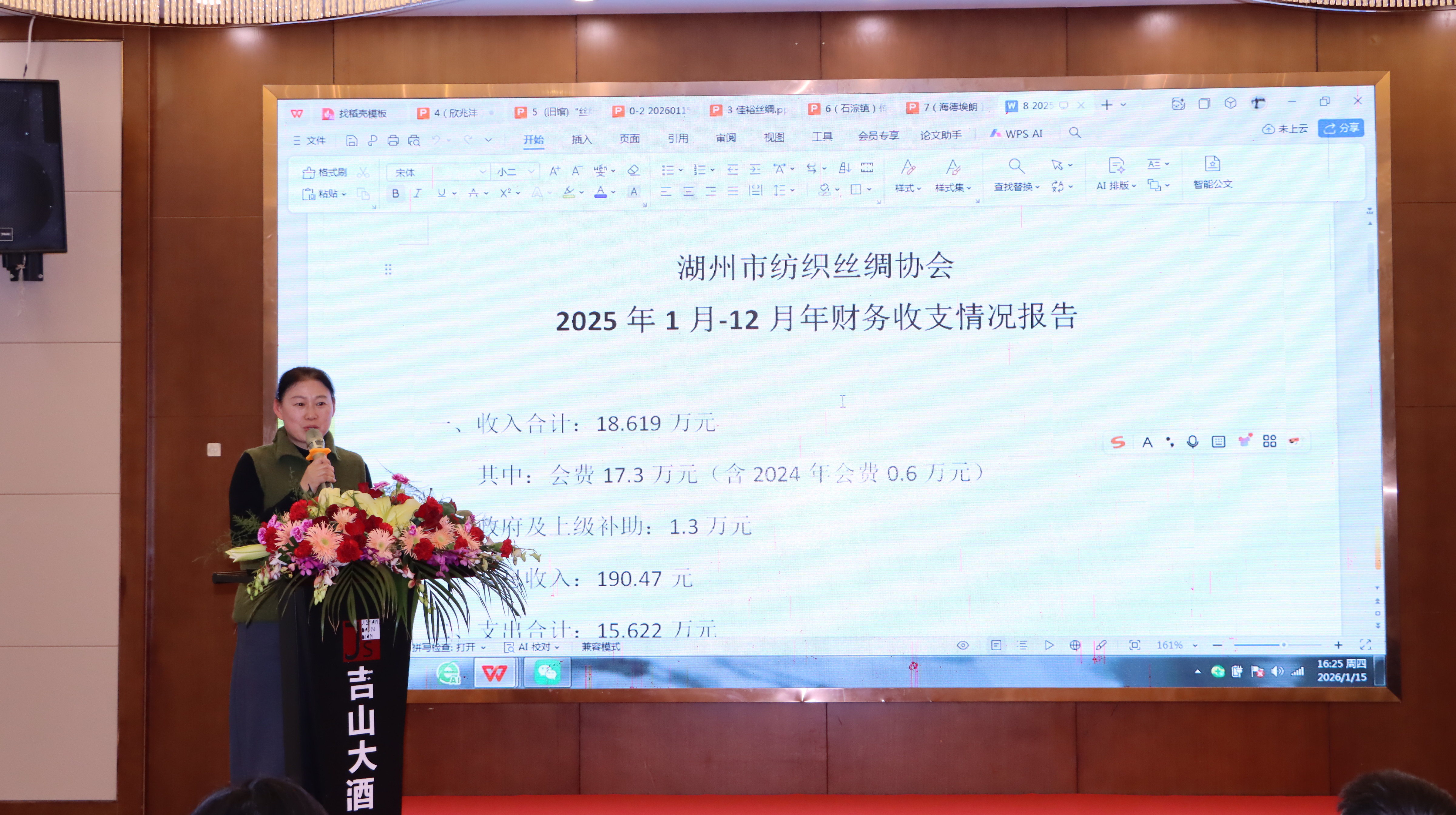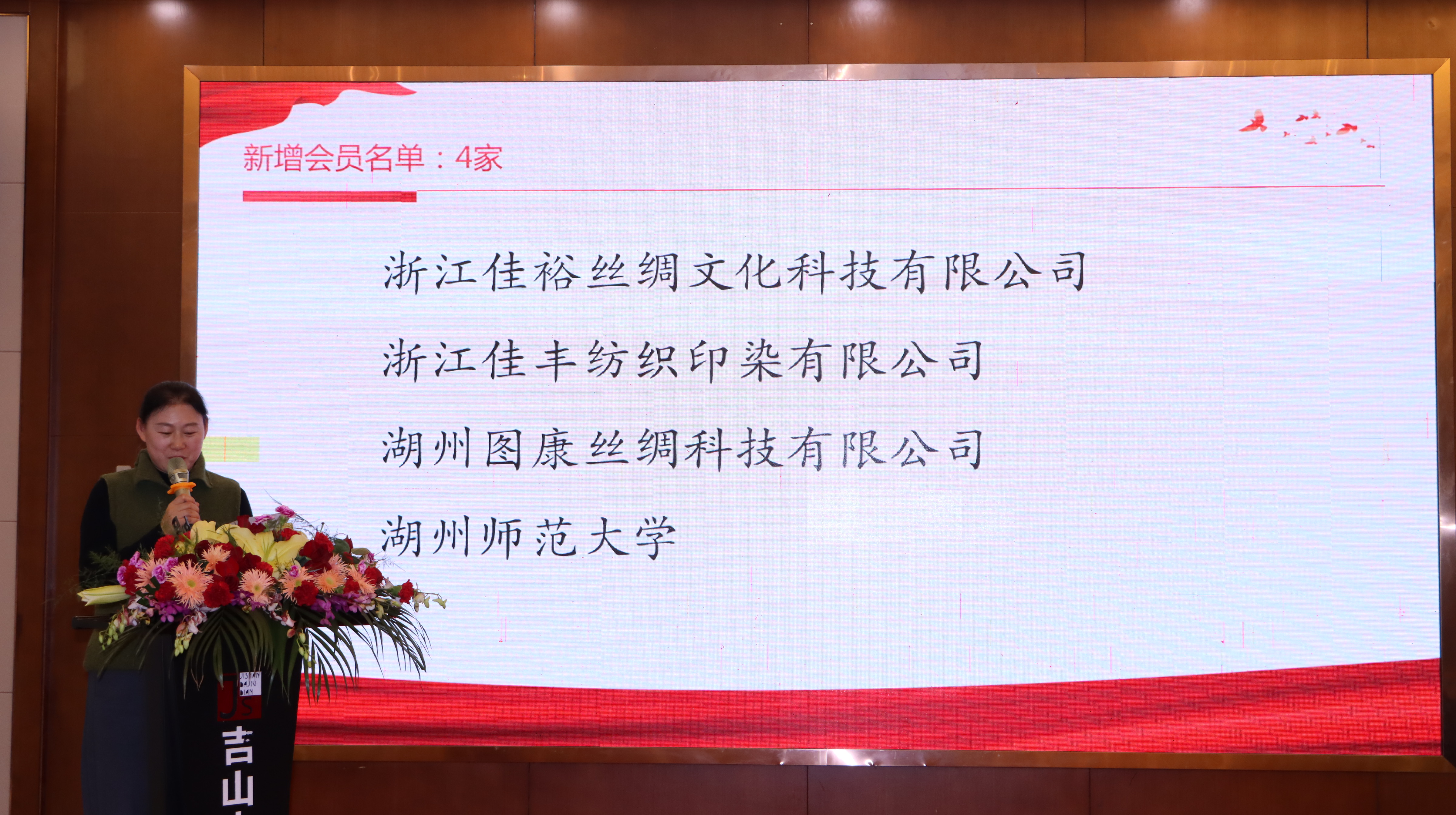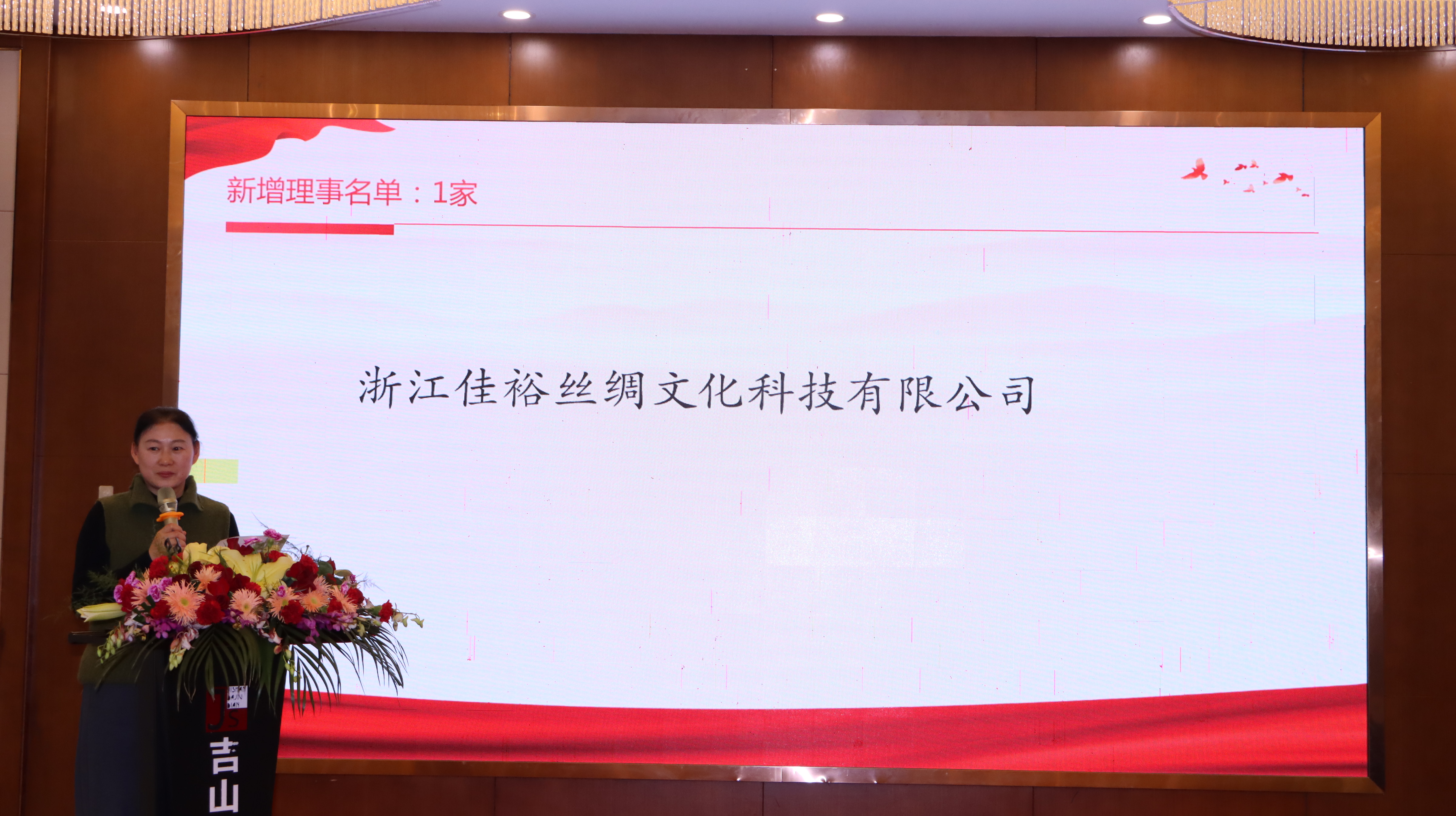 湖州市絲綢紡織協(xié)會秘書長龔玲,代表協(xié)會作《2025年度財(cái)務(wù)收支報(bào)告》的說明及理事(浙江佳裕絲綢文化科技有限公司)的議案,均獲大會審議通過。