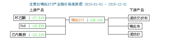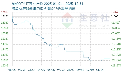 以錦綸DTY為例,從年初 17080 元 / 噸,一路下跌至 11 月的 13560 元 / 噸,全年最大跌幅達(dá) 20.61%;僅在 12 月小幅回升至 13760 元 / 噸,整體處于近五年低位。