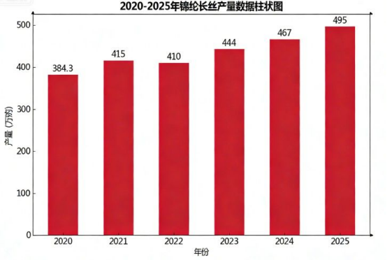 近幾年錦綸長絲產(chǎn)量穩(wěn)中持漲,2023年中國錦綸長絲產(chǎn)量達(dá)到444萬噸,同比上升8.29%;2024年錦綸長絲產(chǎn)量為467萬噸,同比上升5.18%。2025年錦綸長絲產(chǎn)量為495萬噸,同比上升近6.00%。近3年,我國錦綸長絲年產(chǎn)量都已超過400萬噸,占全球總產(chǎn)量的三分之一左右。