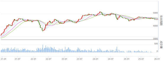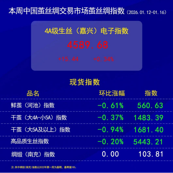 今日(2026年1月16日,周五)中國繭絲綢交易市場生絲電子指數(shù)上漲0.15%報收于4589.68點,本周生絲指數(shù)累計上漲0.34%。B絲2022D(商檢4A級生絲):260125合約上漲0.12萬元報收于45.96萬元;260325合約上漲0.12萬元報收于46.38萬元;260925合約報平,收于45.78萬元。