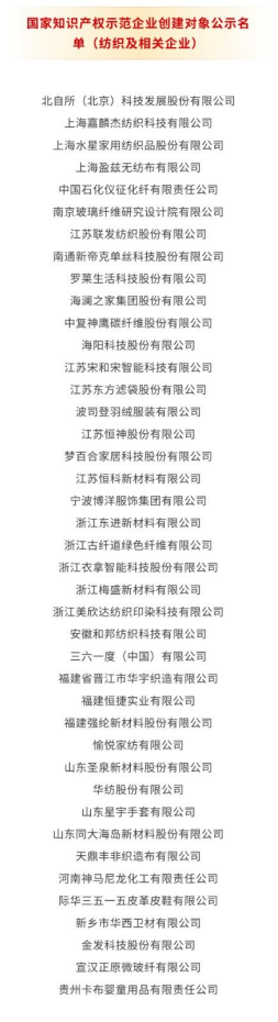 近日,國家知識產(chǎn)權(quán)局發(fā)布國家知識產(chǎn)權(quán)強國建設(shè)示范創(chuàng)建對象評審結(jié)果公示,全國超千家企業(yè)成功入圍,其中紡織及相關(guān)領(lǐng)域企業(yè)達 40 余家,躋身示范創(chuàng)建行列。