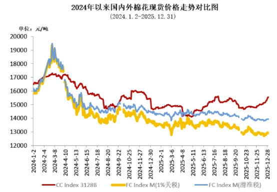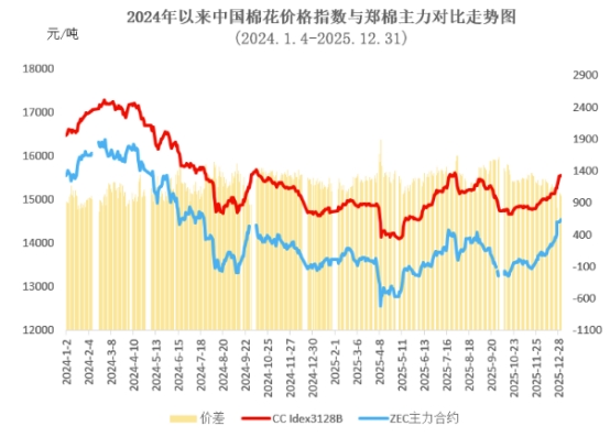 12月市場(chǎng)關(guān)注2026年棉花目標(biāo)價(jià)格政策調(diào)整,鄭棉期貨看漲預(yù)期較強(qiáng),資金參與度顯著提升,主力合約CF2605震蕩上行,月初結(jié)算價(jià)在13760元/噸,月中突破14000元/噸關(guān)鍵阻力位后加速拉漲至月末14550元/噸高位。相比于現(xiàn)貨價(jià)格,期貨市場(chǎng)對(duì)基本面和消息面反應(yīng)更為強(qiáng)烈,期現(xiàn)價(jià)差有所縮小,月末鄭棉主力結(jié)算價(jià)14550元/噸,低于同期價(jià)格指數(shù)1006元/噸,兩者價(jià)差環(huán)比收窄185元/噸。鄭棉主力合約月均結(jié)算價(jià)14009元/噸,環(huán)比上漲467元,同比上漲504元。