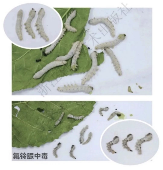 氟鈴脲導(dǎo)致桑蠶急性中毒癥狀為不吃、不動(dòng)、不吐液,1天后蠶體僵直、側(cè)倒,觸之能動(dòng),有假死現(xiàn)象;慢性中毒則食桑不旺,不亂爬、不搖頭、不吐液,蠶體瘦小,表皮僵硬,部分蠶皮膚破裂。多數(shù)蠶入眠推遲,個(gè)別蠶不能蛻皮,發(fā)育開差拉大,群體發(fā)育不齊。
