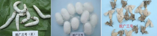 皖蠶6號(hào),蟲蛹率98.44%,繭層率21.02%;盒種平均產(chǎn)量48.0公斤,比對(duì)照品種秋豐×白玉提高約7.07%。皖豐×潤(rùn)康,蟲蛹率98.47%、繭層率20.86%,繭絲長(zhǎng)1045.79米;該品種為血液型膿病“超強(qiáng)”抗性蠶品種。皖廣3號(hào),蟲蛹率99.01%,萬(wàn)蠶收繭量和萬(wàn)蠶繭層量分別高于對(duì)照組合薪杭×白云5.18%和5.38%。皖蠶8號(hào),蟲蛹率99.32%,萬(wàn)蠶收繭量、萬(wàn)蠶繭層量分別高于對(duì)照菁松×皓月4.43%、5.96%。