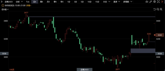 【1】盤面表現(xiàn):BU 2603主力合約日內(nèi)一路上行,強(qiáng)勢拿下能源板塊的漲幅最高。收盤價(jià)3242,較昨日收盤價(jià)+2.92%,盤中最高觸及3242,最低3169。