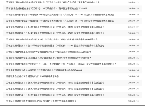 1月19日,招銀理財發(fā)布公告稱,對旗下招銀理財招睿穩(wěn)泰十四月封閉 77 號固定收益類理財計劃給予階段性費率優(yōu)惠,固定投資管理費從0.15%降至0,并同步調(diào)降了多只理財產(chǎn)品費率。