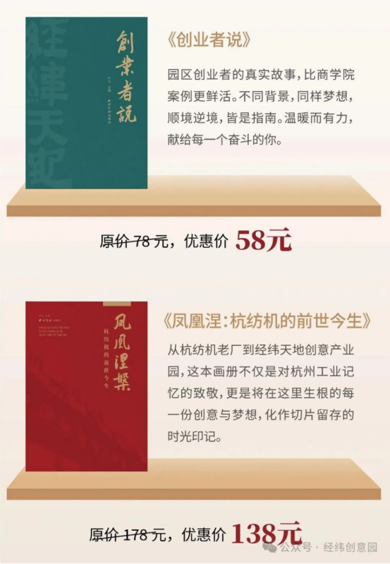 《創(chuàng)業(yè)者說》與《鳳凰涅槃:杭紡機(jī)的前世今生》這兩本書由西泠印社出版社出品。一本記錄園區(qū)創(chuàng)業(yè)者的奮斗身影,一本定格從杭紡機(jī)老廠到經(jīng)緯天地創(chuàng)意產(chǎn)業(yè)園的時(shí)光蛻變,既是對過往的回望,也是對未來的寄語,為七秩紀(jì)念留下印記。