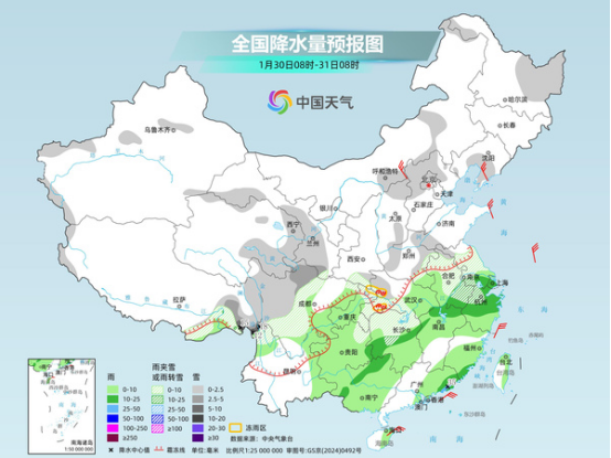 今明天(1月30日至31日),冷空氣將繼續(xù)給我國帶來降溫,局地降溫幅度可達10℃以上,南北方多地最高氣溫將轉(zhuǎn)為較常年同期偏低狀態(tài)。同時,中東部較大范圍雨雪過程仍持續(xù),雪線逐漸南壓至湖南北部、安徽南部、浙江北部一帶,多地雨雪混雜,湖南局地有凍雨。好在冷空氣來去匆匆,2月初氣溫將迅速回升,大部地區(qū)也將迎來降水間歇期。