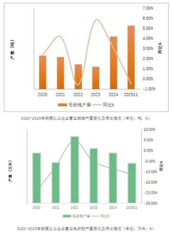 2025年,毛紡行業(yè)生產結構繼續(xù)分化,主要產品產量隨市場需求調整呈現差異化變化,產品結構在創(chuàng)新驅動下加速向高端化、功能化、綠色化升級。從產量變化來看,毛紗線與毛織物作為主要產品,2025年,毛紗線產量同比增長0.2%,毛織物同比下跌10.7%,跌幅較上半年收窄8.9個百分點。今年以來,毛紡行業(yè)的生產隨著國際貿易氛圍的波動而波動在內外市場的雙重壓力下,企業(yè)積極應對,尋求觸底恢復。