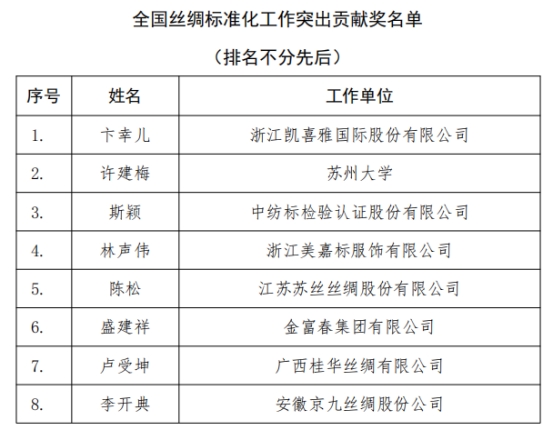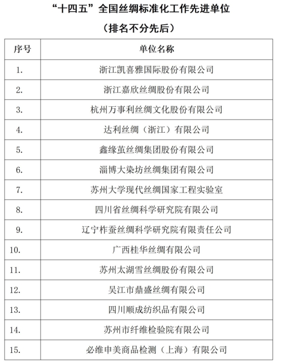 表彰浙江凱喜雅國際股份有限公司等15家“‘十四五’全國絲綢標(biāo)準(zhǔn)化工作先進(jìn)單位”