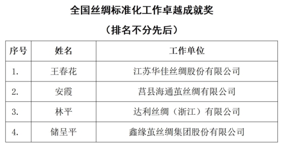授予王春花等4人“全國絲綢標(biāo)準(zhǔn)化工作卓越成就獎(jiǎng)”