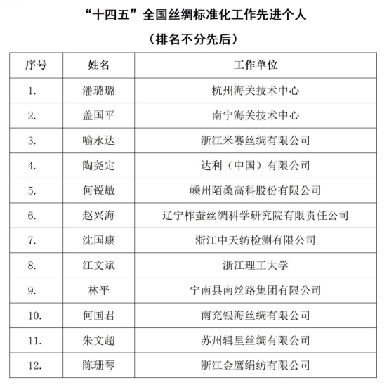 授予潘璐璐等12人“‘十四五’全國絲綢標(biāo)準(zhǔn)化工作先進(jìn)個(gè)人”榮譽(yù)稱號(hào)