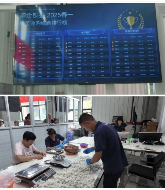 二是破“收購難”,儀器評繭顯公平。鎏金銅蠶公司引進鮮繭儀評電子化系統(tǒng),按“殼重、上車率、含水率、色澤、僵蛹”5項指標打分,蠶農在等候區(qū)就能通過大屏看評分、知價格。以往“毛腳繭”混著賣,現(xiàn)在6A級蠶繭每斤能多賣5-8元,“優(yōu)繭優(yōu)價”真正落地。三是提“效率難”,分段養(yǎng)殖增批次。推行“小蠶集中育、中蠶工廠育、大蠶農戶育”的“三段式”模式,將蠶農自養(yǎng)周期從35天壓縮到15天,全年養(yǎng)蠶批次從6批增至8批。池河鎮(zhèn)試點戶張產收益最高達4556元,比傳統(tǒng)模式多賺1000元左右。