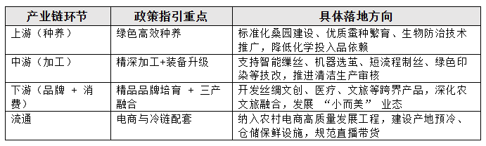 1. 政策定位:將繭絲綢納入縣域富民產(chǎn)業(yè)與農(nóng)業(yè)現(xiàn)代化重點(diǎn)賽道