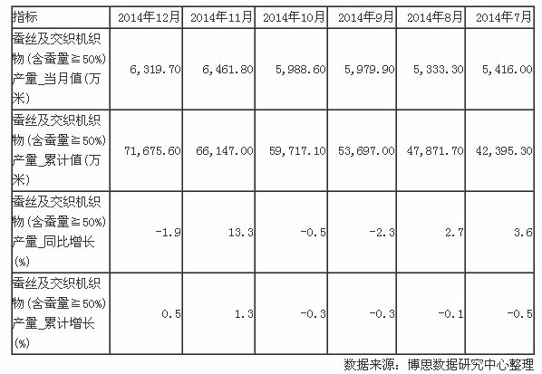 2014年我國蠶絲及交織機織物產(chǎn)量達71675.6萬米 累計增長0.5%