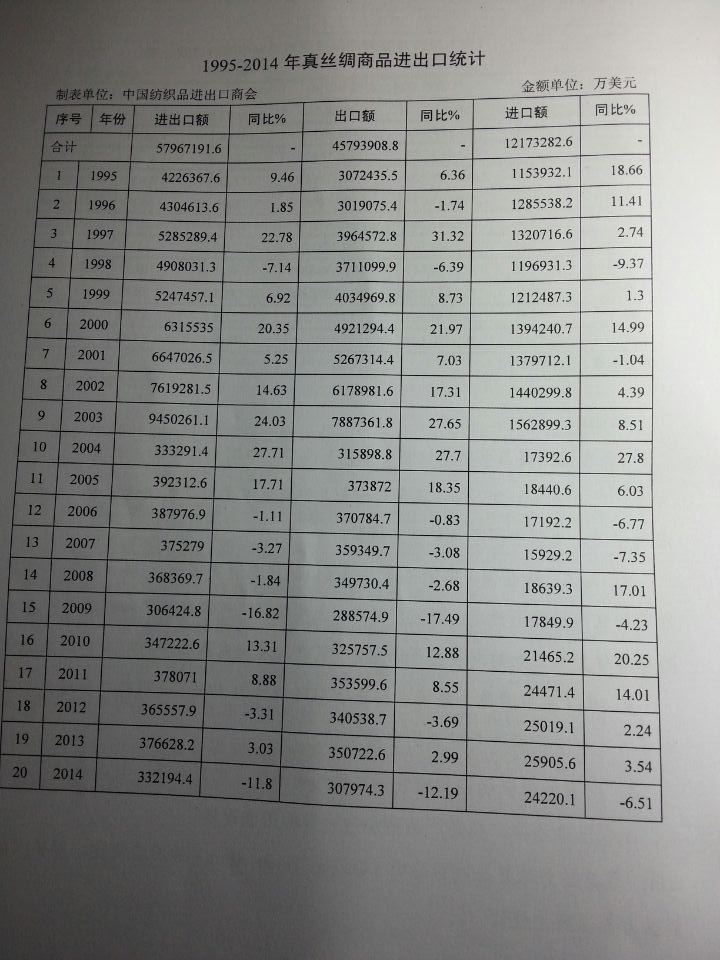1995-2014年真絲綢制成品進出口統(tǒng)計