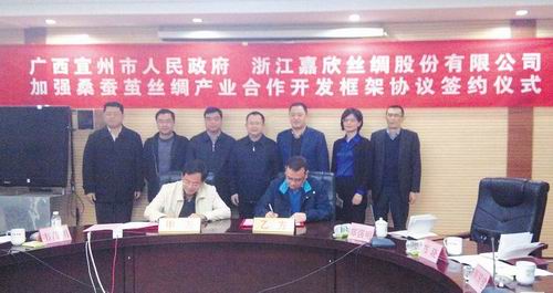 3月14日,嘉欣絲綢董事長周國建,帶領(lǐng)公司總裁室的相關(guān)領(lǐng)導(dǎo)及繭絲業(yè)務(wù)部門的經(jīng)理等,前往廣西宜州地區(qū)進(jìn)行了考察交流,并與宜州市人民政府簽訂了加強(qiáng)繭絲綢產(chǎn)業(yè)合作開發(fā)的框架協(xié)議。中共宜州市市委書記周飛,中共宜州市市委副書記、市人民政府市長梁寧,中共宜州市市委副書記龍校等領(lǐng)導(dǎo),以及宜州市的桑蠶循環(huán)辦、發(fā)改局、工信局、招商局、商務(wù)局、金融辦、絲綢行業(yè)協(xié)會等政府職能部門,參加了隆重的簽字儀式。嘉欣絲綢總裁徐鴻和中共宜州市委常委、市人民政府副市長韋茂明,代表雙方在合作框架協(xié)議上簽字。合作框架協(xié)議的簽訂,預(yù)示著嘉欣絲綢深度融入中西部繭絲綢行業(yè)的戰(zhàn)略性步驟的正式開啟。