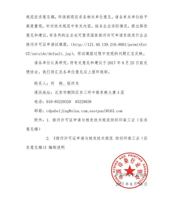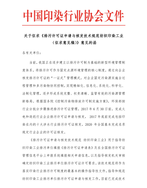 中國印染行業(yè)協(xié)會(huì)關(guān)于征求《排污許可證申請(qǐng)與核發(fā)技術(shù)規(guī)范 紡織印染工業(yè)》意見的函