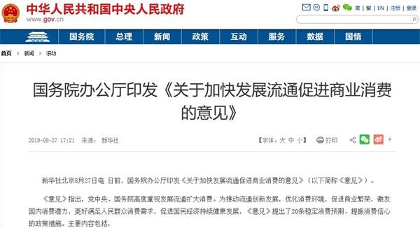 國務(wù)院8月27日發(fā)布了《關(guān)于加快發(fā)展流通促進(jìn)商業(yè)消費(fèi)的意見》(簡稱《意見》),提出20條提振消費(fèi)信心措施,包括逐步放寬或取消汽車限購,支持商品以舊換新,擴(kuò)大成品油市場準(zhǔn)入,鼓勵(lì)金融機(jī)構(gòu)創(chuàng)新消費(fèi)信貸產(chǎn)品和服務(wù),加大對(duì)新消費(fèi)等金融支持等,針對(duì)流通消費(fèi)領(lǐng)域存在的一些瓶頸和短板進(jìn)行了完善,并進(jìn)行了部門分工,培育消費(fèi)熱點(diǎn)。