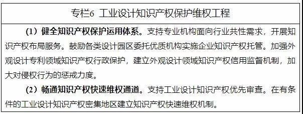 (十二)強化設計知識產權保護。發(fā)揮國家知識產權運營公共服務平臺作用,鼓勵有條件的地區(qū)和園區(qū)探索建立知識產權快速維權機制和知識產權成果轉化平臺。加大懲戒力度,嚴厲打擊外觀設計專利侵權等違法行為,維護行業(yè)競爭秩序。加強設計類評獎、大賽、展覽的知識產權保護。順應設計產業(yè)發(fā)展實際,探索新業(yè)態(tài)、新領域的外觀設計保護,適當擴大外觀設計專利權保護客體的范圍。