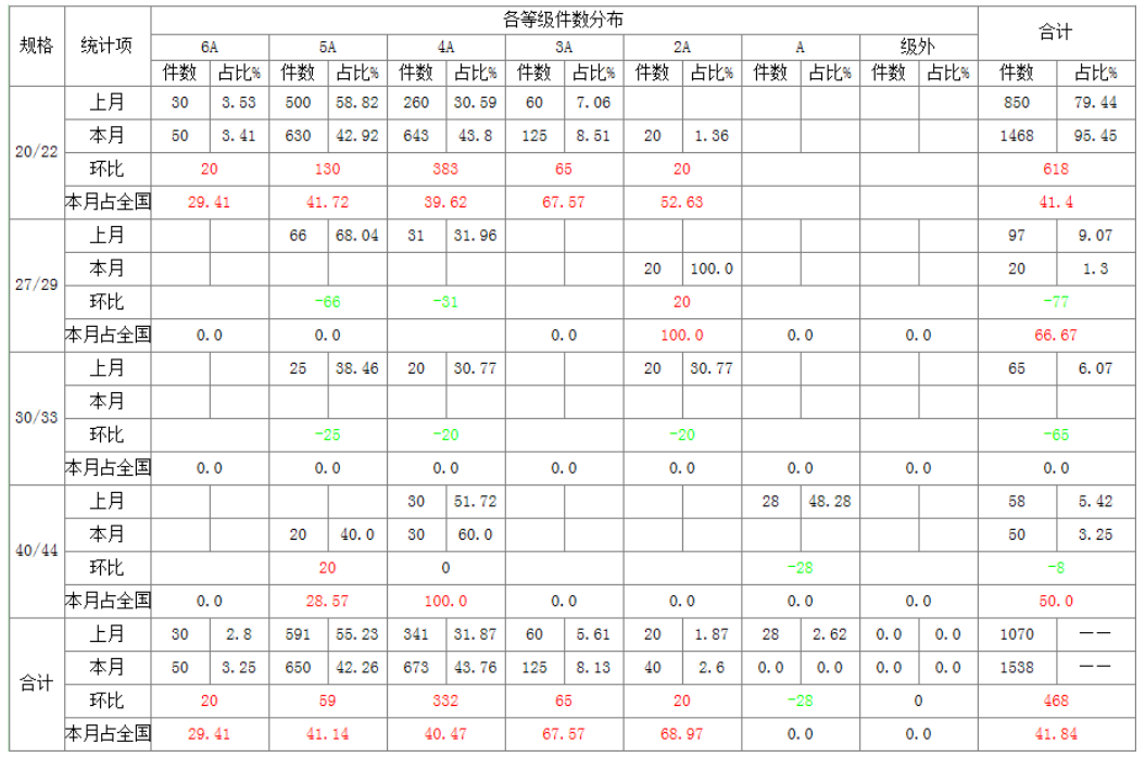 按生絲規(guī)格統(tǒng)計(jì): 20/22 規(guī)格 1468 件,占比 95.45%,占全國(guó)總量 41.4%,環(huán)比增加 618 件;27/29 規(guī)格 20 件,占比 1.3%,占全國(guó)總量 66.67%,環(huán)比減少 77 件;30/33 規(guī)格本月沒有,環(huán)比減少 65 件;40/44 規(guī)格 50 件,占比3.25%,占全國(guó)總量 50.0%,環(huán)比減少 8 件。