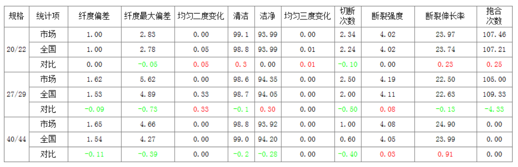 40/44 規(guī)格的產(chǎn)品,本市場(chǎng)生絲超市產(chǎn)品優(yōu)于全國(guó)平均水平的指標(biāo)有:斷裂伸長(zhǎng)率,與全國(guó)平均水平持平的指標(biāo)有:均勻二度變化、均勻三度變化、斷裂強(qiáng)度、抱合,略低于全國(guó)平均水平的指標(biāo)有:纖度偏差、纖度最大偏差、清潔、潔凈、切斷。