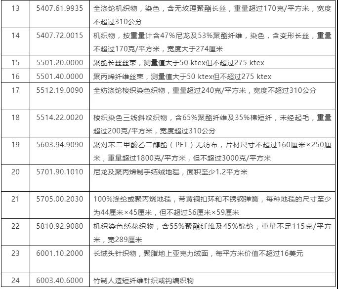 本次修訂的紡織品描述與HS碼如下,出口企業(yè)需重新審查是否符合排除條件: